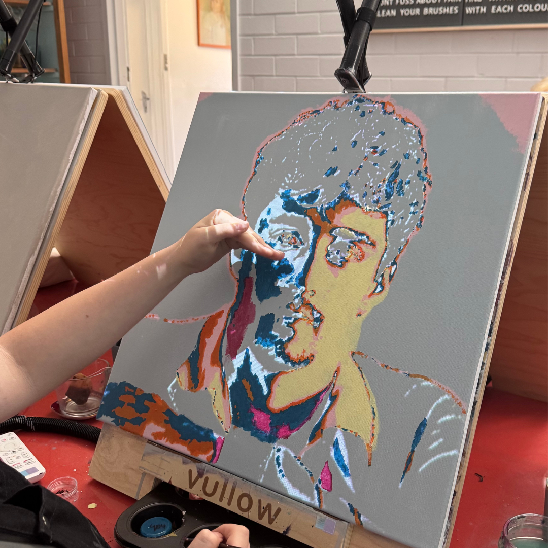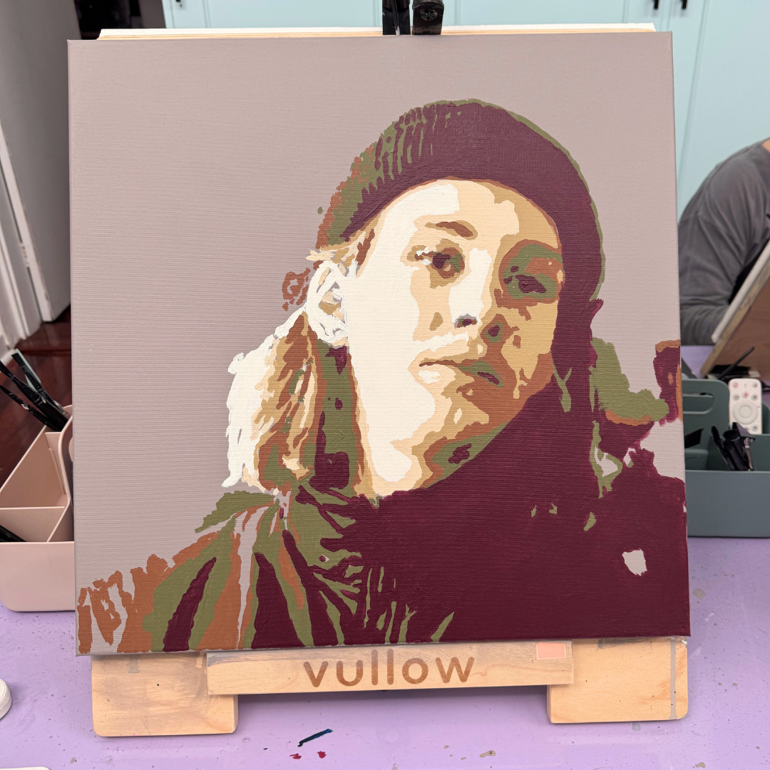 You start with a photo of your choice. The Vullow system then breaks that image into six layers, each assigned a specific colour. The image is projected onto your canvas, and you paint one layer at a time. Shadows, highlights and details are guided by the projection, helping you build the portrait gradually.